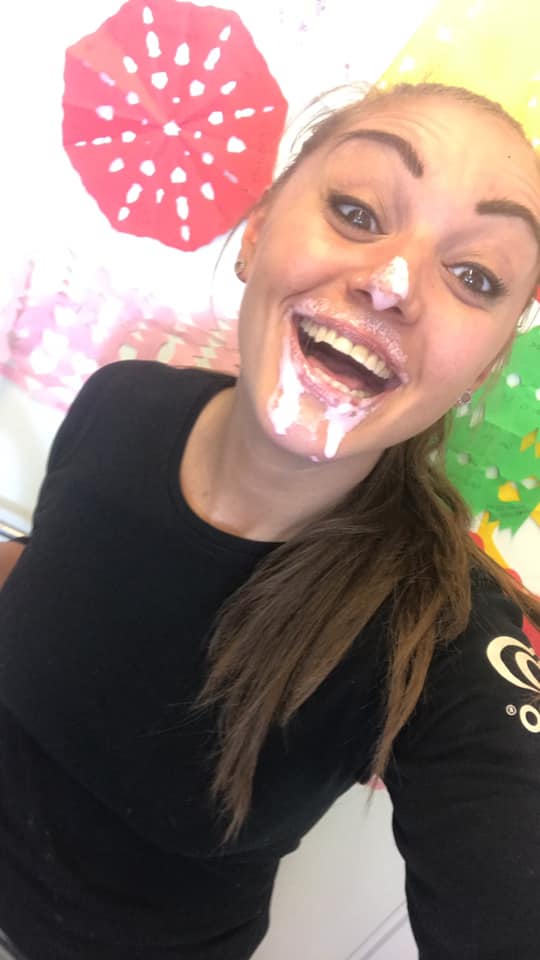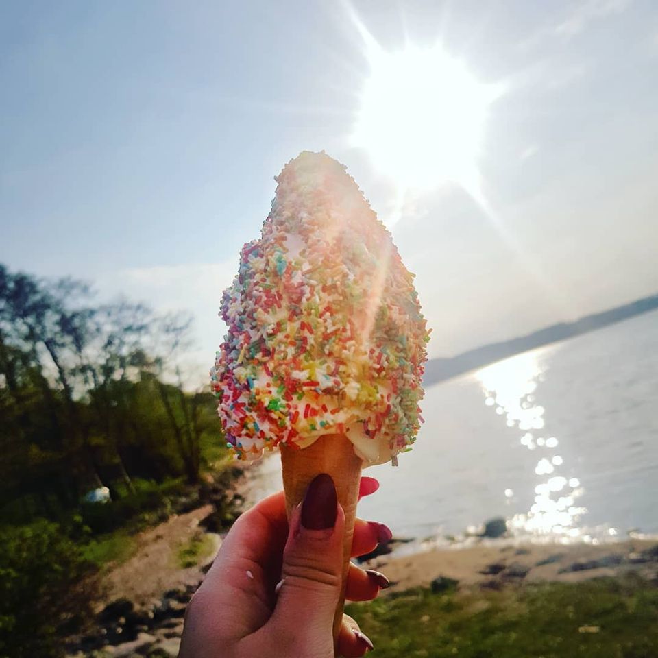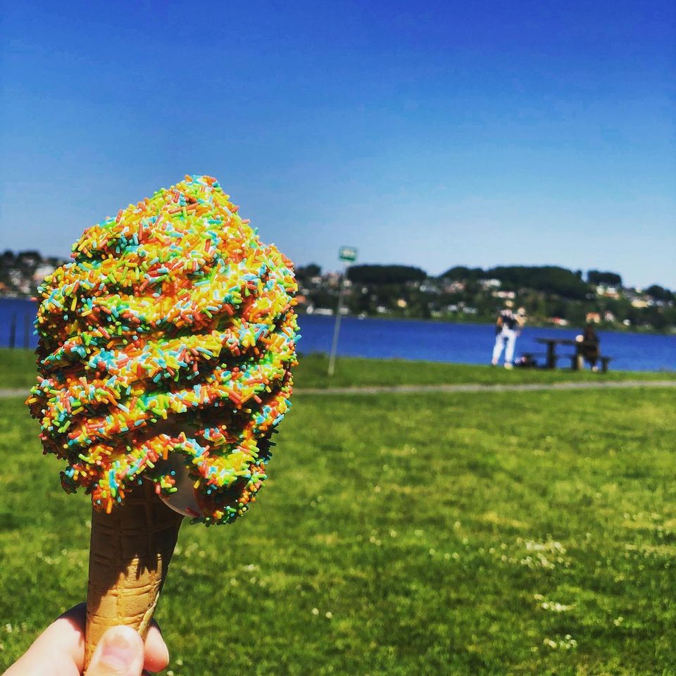 Jordbær, vanilje eller blandet softice med drys
